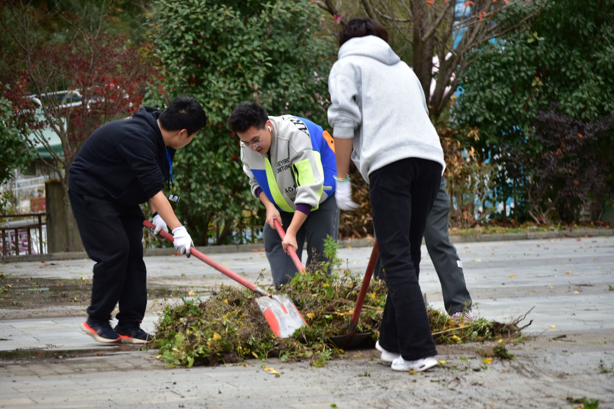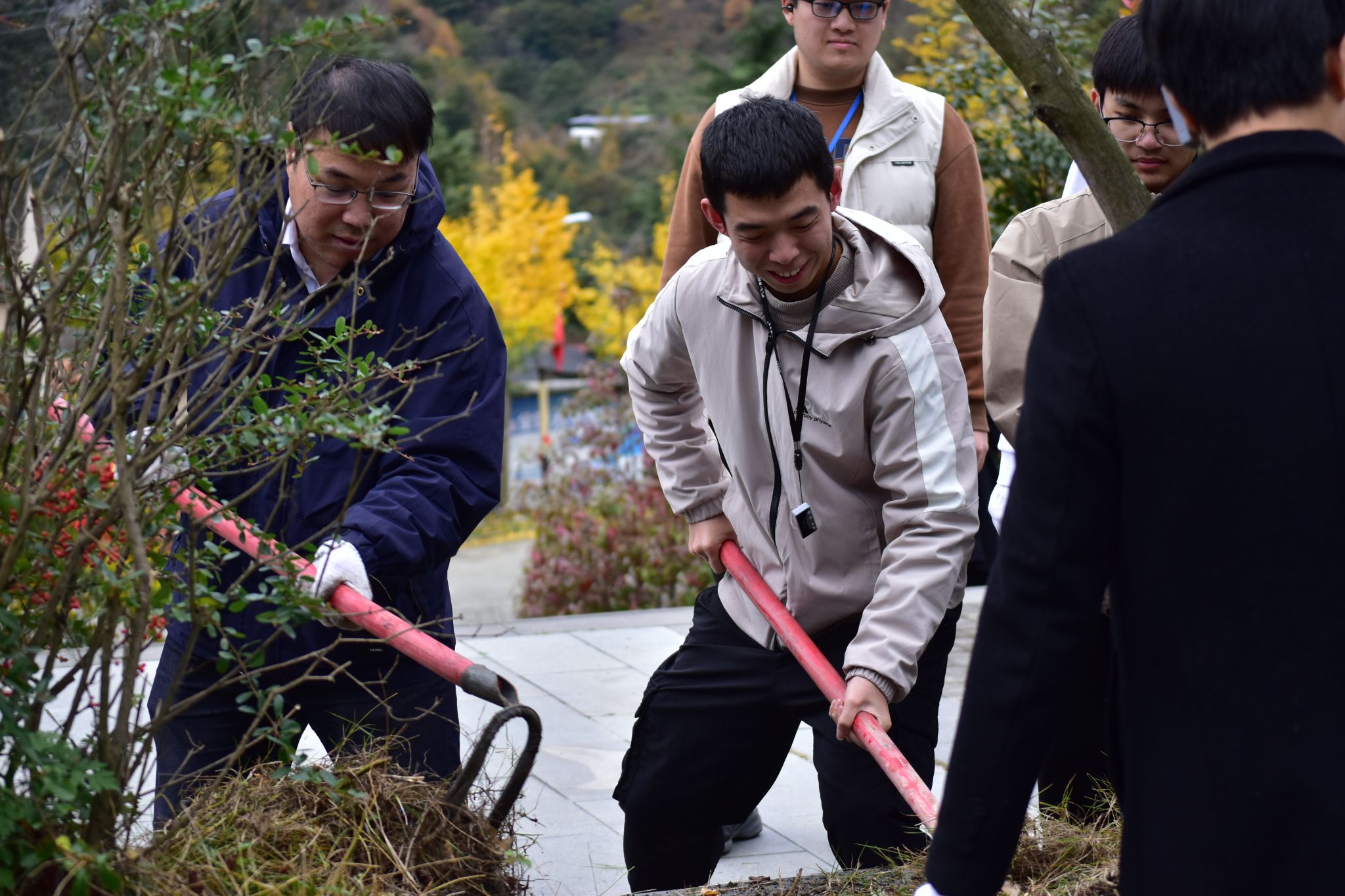 在保护基地周边草坪上,同学们挥汗如雨,投身杂草清除劳动。大家戴着手套,挥动锄头,不惧寒风凛冽,汗水湿透衣衫,杂草地上坑洼崎岖,飞扬的泥巴粘在鞋上、手上,这让同学们愈发意识到劳动的艰辛与不易,也更加珍惜劳动的果实和幸福。