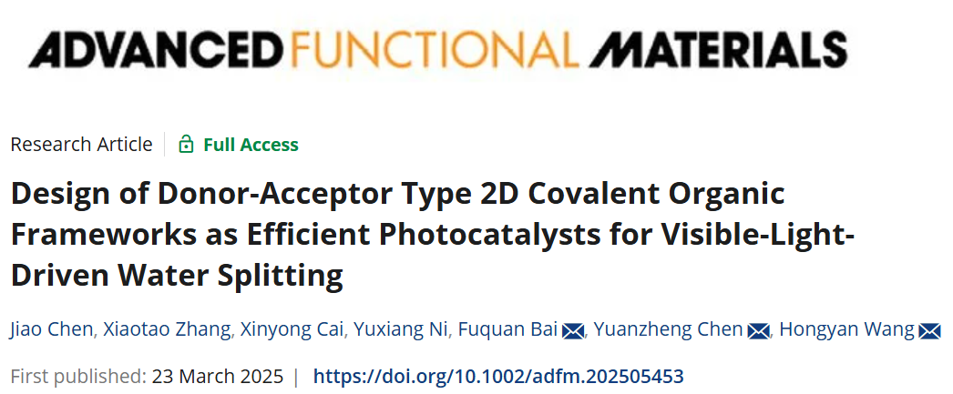 近日,yl23455永利官网微纳器件和材料物理团队王红艳教授课题组在二维共价有机框架(2D COFs)光催化剂材料的设计及其性能研究中取得重要研究进展,相关研究成果以yl23455永利官网为第一单位,以“Design of Donor-Acceptor Type 2D Covalent Organic Frameworks as Efficient Photocatalysts for Visible-Light-Driven Water Splitting”为题,发表在材料学领域顶级期刊《Advanced Functional Materials》(IF=18.5),该论文第一作者为王红艳教授指导的博士研究生陈娇,通讯作者为yl23455永利官网王红艳教授和陈元正副教授、吉林大学化学学院白福全教授。