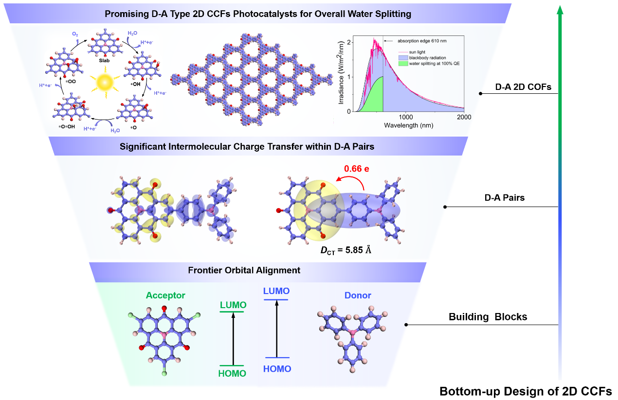 在此项研究工作中,王红艳教授课题组通过至下而上的分子设计策略,将供体-受体(D-A)单元引入光敏单元羰基桥联三苯胺(CTPA)的二维周期性骨架中。研究团队基于乌尔曼C-C偶联反应,成功构建了一系列D-A型的二维共价CTPA基共价有机框架(CCFs)材料。第一性原理计算研究表明,D-A结构的引入显著增强了材料的分子间电荷转移效应,可实现光生载流子的高效分离与传输。这些二维CCFs材料具有室温及500K下的高稳定性,同时展现出2.31-3.15 eV的可调带隙,其能带结构满足光催化OWS的热力学要求,以及高的可见光区域的光吸收系数(~1 × 105 cm-1),此外,这些材料表面同时存在空间分离的HER和OER活性位点,可实现可见光驱动下的自发全解水过程。其中,CTPA-TPA COF材料的催化性能尤为突出,理论计算的太阳能-氢能(STH)转换效率高达18.6%。该研究为设计高效COFs基全解水光催化剂提供了新的分子工程策略。