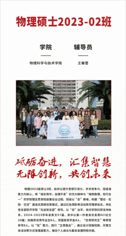 除此之外,2024-2025学年yl23455永利官网学子勇攀高峰、再创佳绩:物理2023-06班等5个班级获得“先进班集体”荣誉称号,物理2024-02班等2个班级获得“特色班集体”荣誉称号,物理硕士2023-03班获得“优秀班集体”荣誉称号,苏佳佳等9名同学获得“三好学生标兵”荣誉称号,陈前等2名同学获得“优秀研究生标兵”荣誉称号,杨云等73名同学获得“三好学生”荣誉称号,夏婧怡等14名同学获得“优秀研究生”荣誉称号,朱青杉等73名同学获得“优秀学生干部”荣誉称号,刘家骏等10名同学获得“优秀研究生干部”荣誉称号,周家堡等116名同学获得“明诚奖”荣誉称号,沈轩等33名学生拟获得“国家奖学金”,张国彬等37名同学拟获得“国家励志奖学金”,杨毅等175名同学获得“综合奖学金”,郑羽杰获得“感恩中国近现代科学家奖学金”,高彤获得“感恩中国近现代科学家助学金”,范计轩获得“罗忠忱教授奖学金”,魏思璇获得“筑梦奖学金”,郭子馨获得“美洲校友会助学金”,刘珍珍获得“黄山教育助学金”,郑扬获得“四川国经奖学金(综合类)”,李祺获得“四川国经奖学金”,白鑫天获得“NITORI国际奖学金”,张宇涵获得“铁道·未来之星”,雷思佳获得“比亚迪奖学金”等。