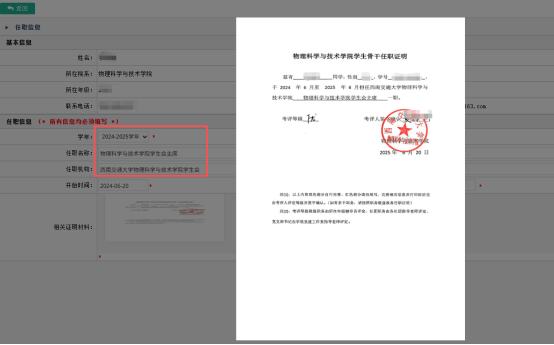 学年勾选2024-2025学年,任职名称、任职机构填写完整,班委任职机构按照“物理/电讯2022-01班”格式填写,相关证明材料需上传任职证明或加盖公章证明(扫描版),示例如下: