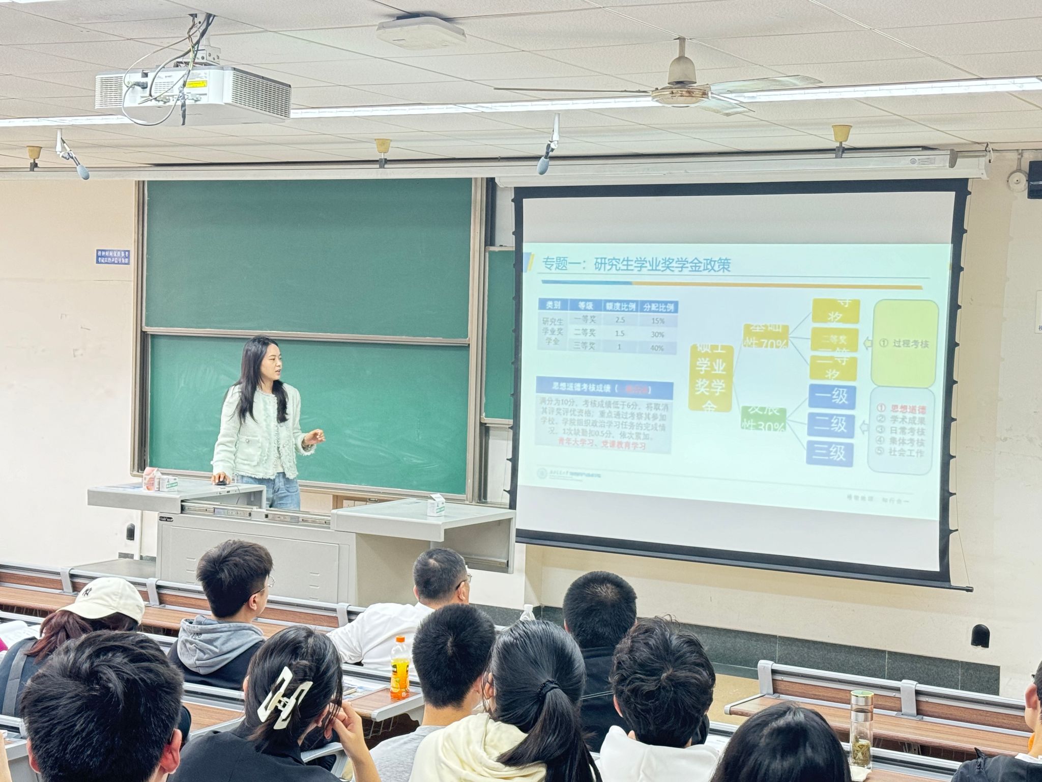 评优助力,逐梦扬华。何迪雅老师为大家介绍了“评奖评优细则”。她详细解读了研究生学业奖学金和国家奖学金的评审标准,明确了评优的具体流程和荣誉称号的评定程序。何老师强调,评奖评优不仅是对学术成绩的认可,也是对个人综合素质的全面考察,因此她鼓励同学们在学业上追求卓越,在科研中取得优异成果,积极参与评优活动,全面提升个人能力。此外,何老师还根据yl23455永利官网学生个人最高荣誉——竢实扬华奖章,向新生寄语:“‘竢’是等待的意思,而‘实’代表果实,二者结合寓意着等待果实成熟。她希望同学们在入学阶段能够脚踏实地,扎实学习和科研,积累知识与经验,最终在毕业时结出属于自己的丰硕果实,实现自己的目标和梦想。