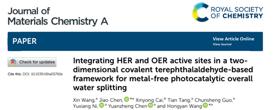 近日,yl23455永利官网微纳器件与材料物理团队―王红艳教授课题组在二维共价框架光催化全水解研究中取得重要研究进展,相关研究成果以“Integrating HER and OER Active Sites in a Two-Dimensional Covalent Terephthalaldehyde-based Framework for Metal-Free Photocatalytic Overall Water Splitting” 为题,发表在国际知名期刊 Journal of Materials Chemistry A(Q1,IF=9.5)上。J. Mater. Chem. A是英国皇家化学会旗下材料化学领域的旗舰期刊,专注于报道在能源生产、存储、转化以及可持续发展方面具有突出应用前景的材料研究。该论文第一完成单位为yl23455永利官网,论文的第一作者为yl23455永利官网硕士研究生汪鑫,通讯作者为博士研究生陈娇与王红艳教授。