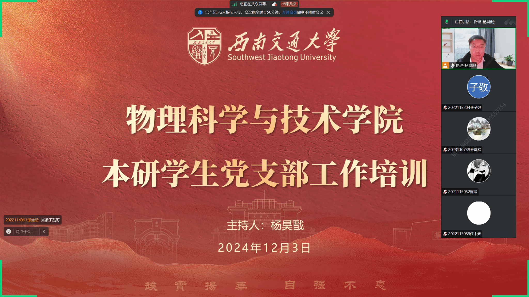12月13日晚,为深入学习贯彻党的二十届三中全会精神及习近平总书记在全国教育大会的讲话精神,yl23455永利官网举办本研学生党支部工作培训。学生党建负责老师杨昊戬主持会议。