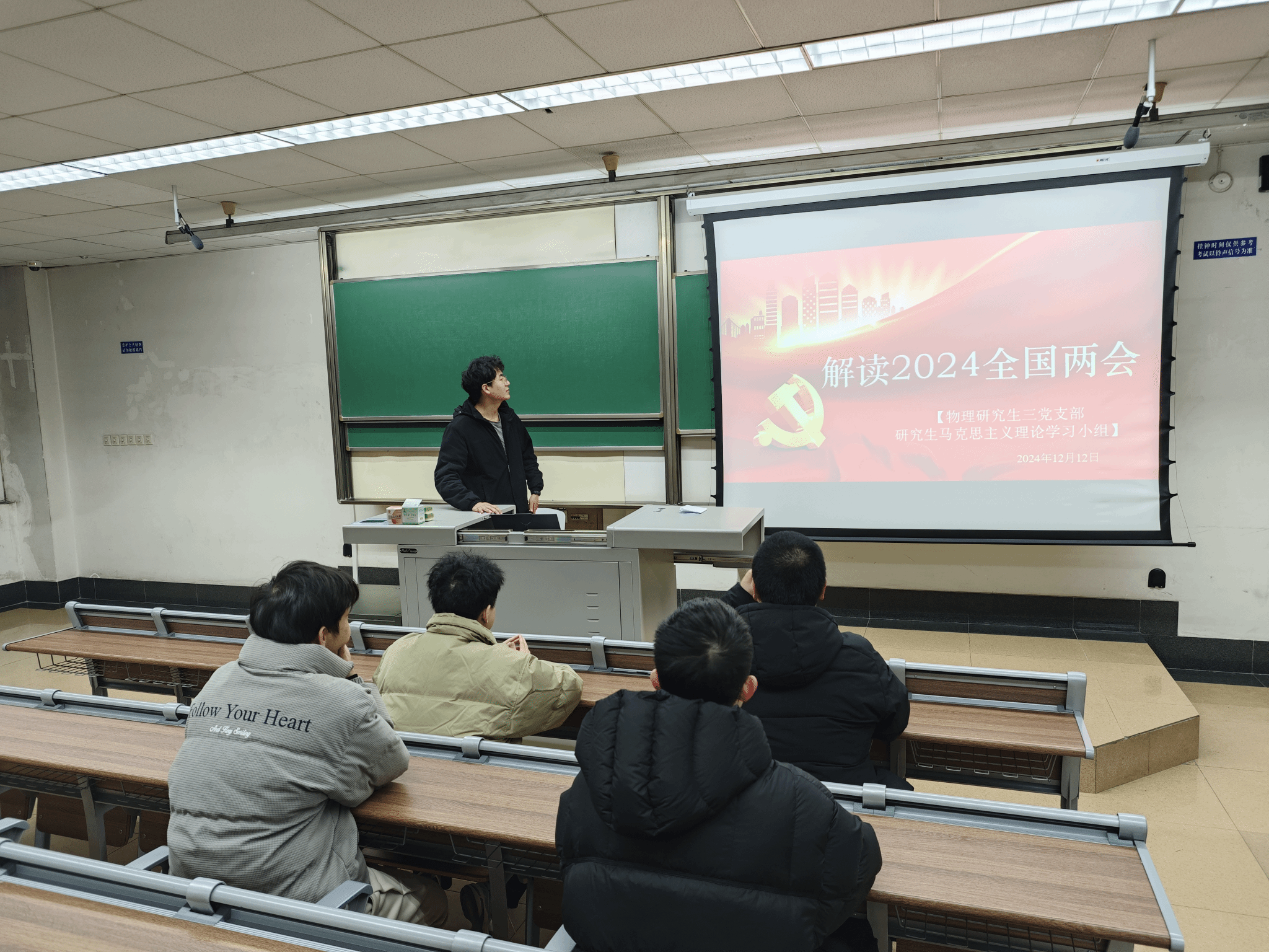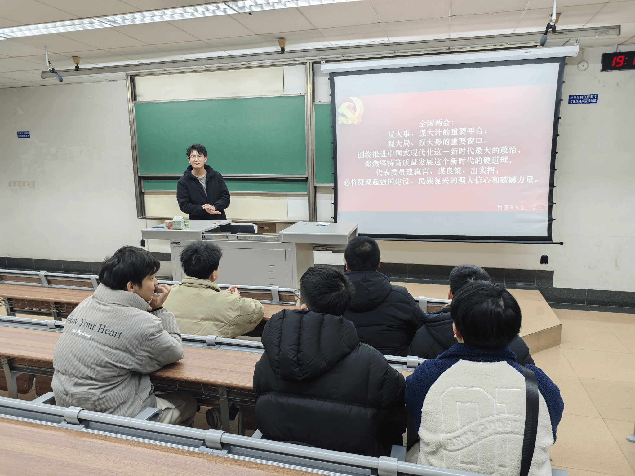接着,从宏观层面介绍了报告的整体框架,结合物理学科特色,深入分析了报告中关于基础研究、关键核心技术攻关、拔尖创新人才培养等方面的具体部署,引导党员同志思考如何将个人科研方向与国家战略需求紧密结合。在讨论环节,支部支委组织小组成员围绕报告中的热点话题展开深入讨论,引导大家结合自身实际,就如何贯彻落实两会精神、推动科研创新建言献策。