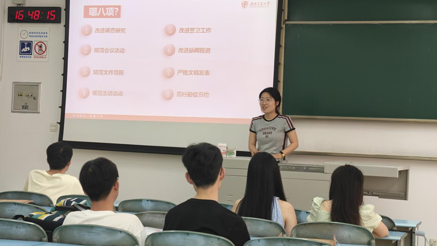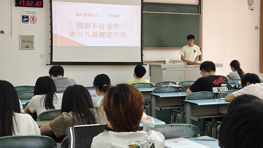 “中央八项规定精神在身边”主题宣讲活动中,支部党员结合实际案例和生活场景,探讨如何在日常生活中贯彻落实中央八项规定精神。大家还分析了高校领域违反中央八项规定精神的典型案例,讨论如何避免类似问题。通过此次主题宣讲活动,学生党员们深入学习了中央八项规定精神,明白了其在日常生活和学习中的具体体现,廉洁意识和责任担当得到了提升,为今后的学习和生活筑牢了廉洁防线。