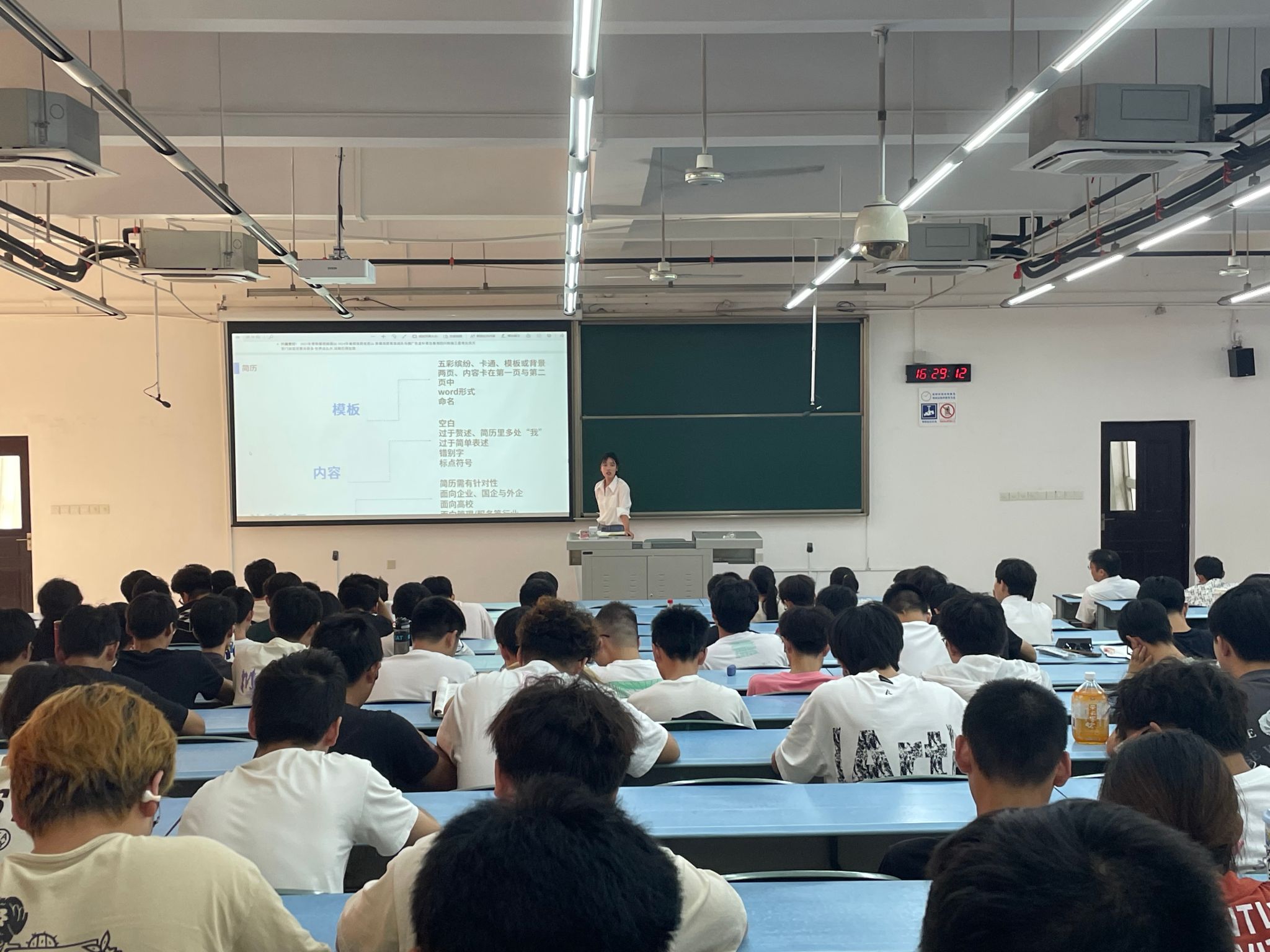 在学风建设与班级建设方面,李若彤结合学生大一制作的简历为大家未来个人规划,鼓励大家积极学习,确立目标;同时对同学们的心理状况、日常生活表示关注和关心。