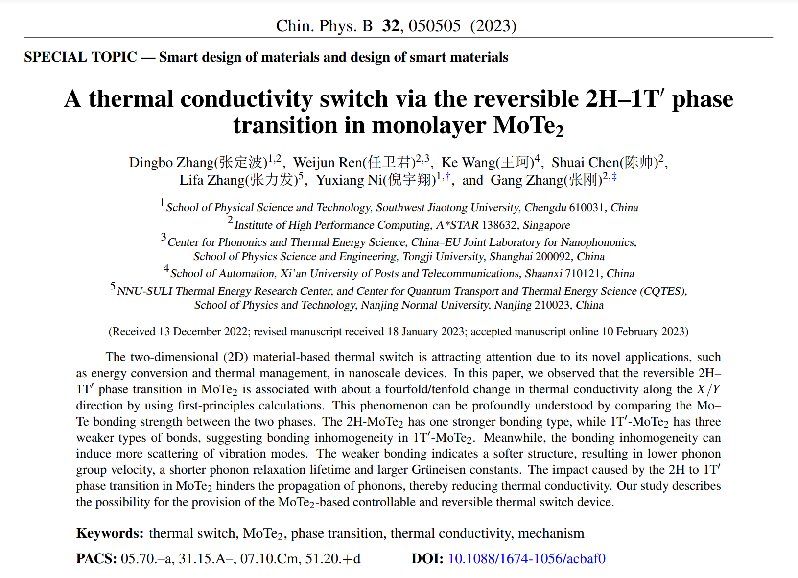 A research paper titled "A thermal conductivity switch via the reversible 2H-1T' phase transition in monolayer MoTe2," authored by Dr. Zhang Dingbo (Postdoctor/Assistant Professor, First Author) and Professor Ni Yuxiang (Corresponding Author) from the School of Physical Science and Technology, has been successfully selected for the "Long Abstract Bilingual Communication Project" in 2024. It is noteworthy that the journal "Chinese Physics B (English)" publishes over 1,000 papers annually, and only 10 papers were recommended and selected for this project this year.